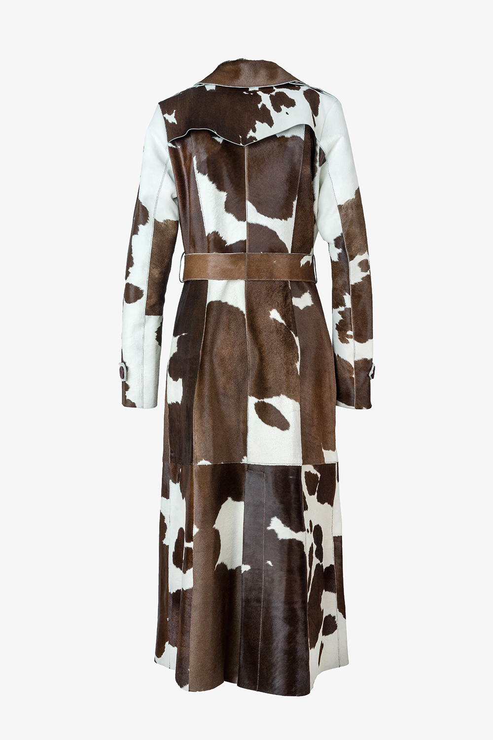 A természetes mintás borjúbőr trenchcoat egy olyan statement darab, amely a klasszikus eleganciát modern és merész dizájnnal ötvözi. A természetes borjúbőrből készült, egyedi mintával ellátott kabát az anyag autentikus megjelenésével tűnik ki, minden egyes darab egyedi mintával rendelkezik a barna és a fehér árnyalataiban. A bőr természetes textúrája mélységet és karaktert kölcsönöz a kabátnak, így ez a trencsni különleges ruhadarabbá válik.