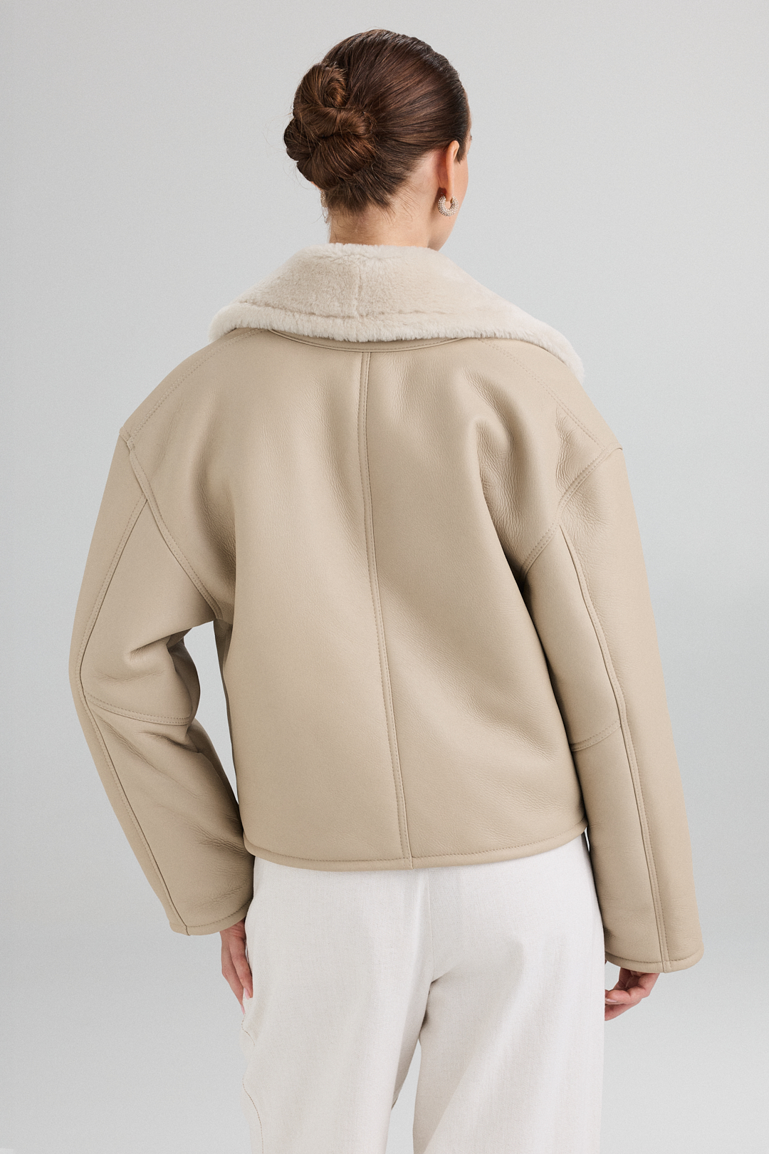 The suede leather is soft, smooth to the touch, and drapes beautifully on the body, delivering a sophisticated look with ease. Flap pockets add a practical accent, while details such as the elastic hem, snap cuffs, and flap covering the zipper create a refined, balanced effect.