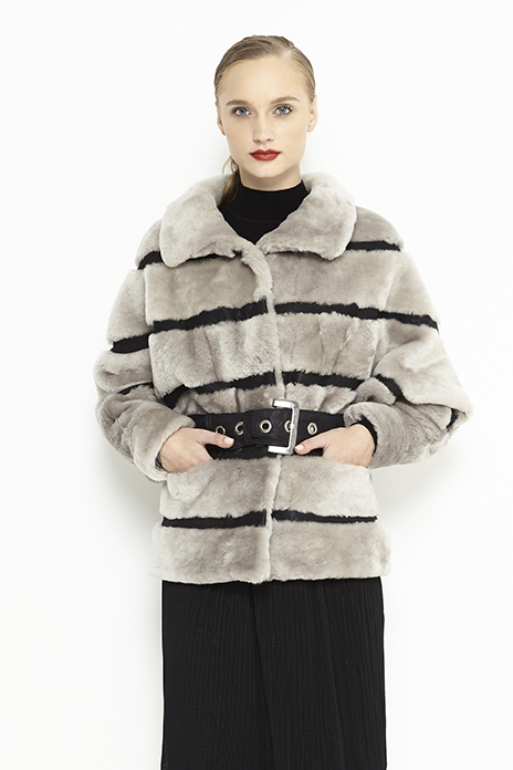 So, you can purchase this fur coat in beige, grey, black or burgundy. Anyway, in every attire the horizontal lines are in black and the waist belt also.